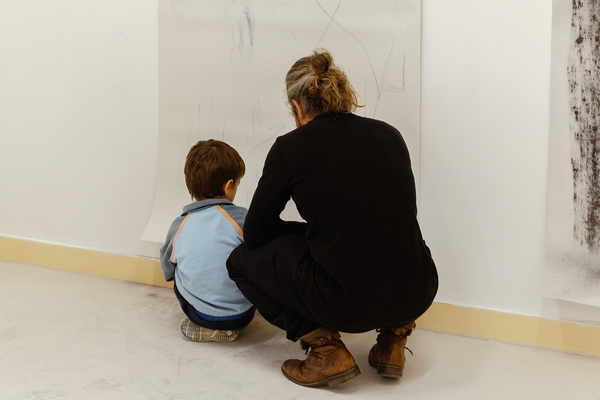 Além dos três desenhos rebocados de Nelson, temos no espaço expositivo três obras de Xana Sousa, um “Desenho Plissado”, que provoca uma imagem através do desenho e do método de plissagem de tecido, que desconstrói e constrói de forma permanente o desenho, e dois “Desenho Riscado” que fazem parte de uma série de desenhos a que Xana intitulou de “Na Campa Que Farás” (2019 - hoje). Estes desenhos riscados evocam a ideia de ausência de corpo num espaço imaginado, a cova, e no tempo, que se desfragmenta quando o conceito de espaço é expungido. Importa, neste momento, a partir destas obras causar uma provocação necessária a partir de uma afirmação de Gustave Flaubert: “Não existe verdade. Apenas existe percepção.”. A percepção pode alterar-se e alterar o sujeito, mas não altera o que é de mais verdadeiro para nós: a nossa própria realidade. A nossa validade enquanto indivíduos num contexto social. Regressando às obras, a referência que lhes foi feita supra, confina-se na produção individual de cada artista que se encontram nos desenhos lixados, trabalhos conjuntos, um total de três desenhos que exploram o suporte na subversão do ato de expungir. O meio riscador deixa de ser o que rasura para evocar, desta forma, poder absoluto sobre a sociedade civil através da omissão, para passar a ser o suporte a expungir o riscador. Neste sentido os artistas Nelson e Xana apresentam uma obra incompleta para que esta sirva um propósito de participação de quem visite “Expunção”. O visitante poderá riscar, marcar o suporte com pontos e traços como se estivesse a expungir algo escrito ou imagem que neste suporte não existem.